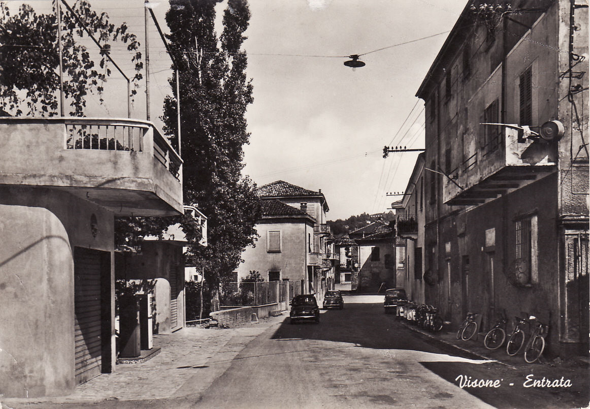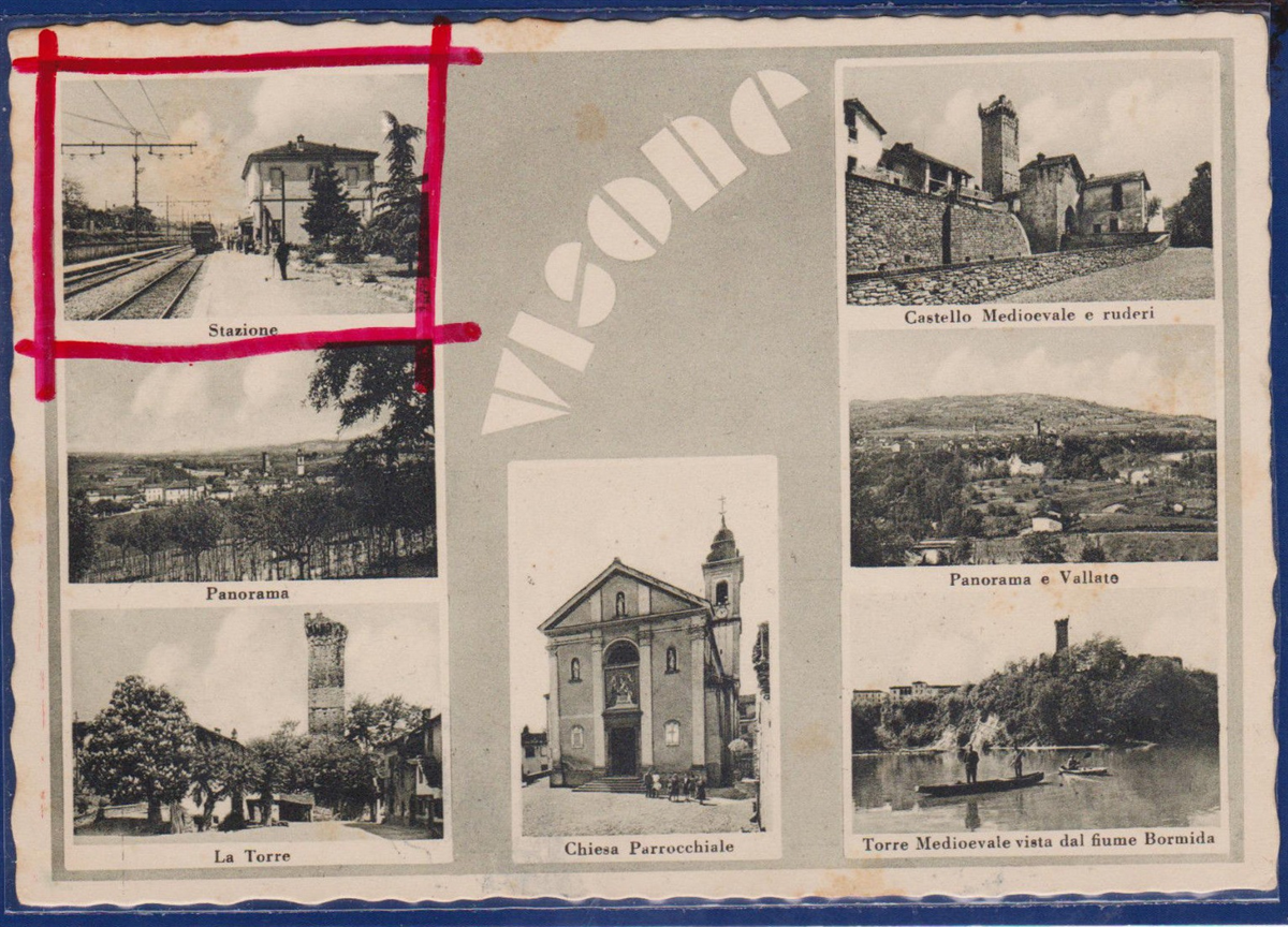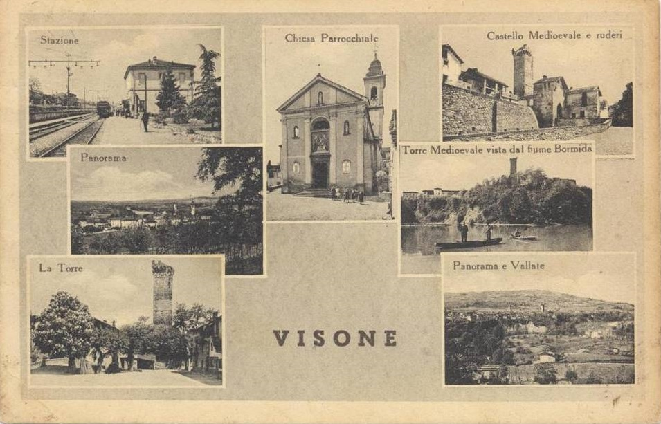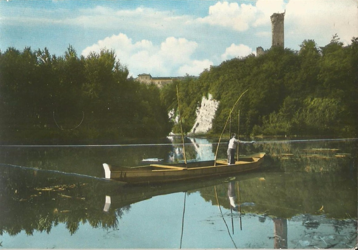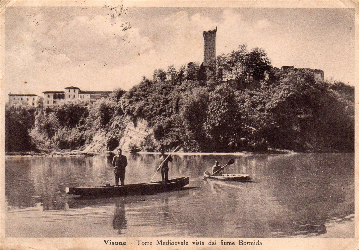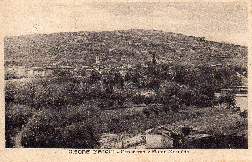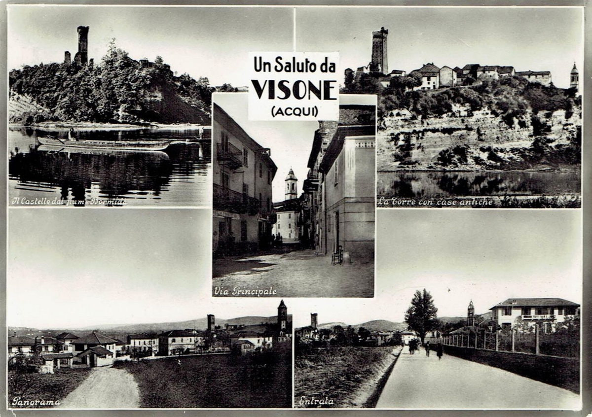 La "nave" (traghetto che collegava il paese con al Regione Cavallera oltre Bormida), con sullo sfondo la Rocca e la torre rinascimentale e, sulla sinistra, il palazzo Bonelli - Madama Rossi, 1941