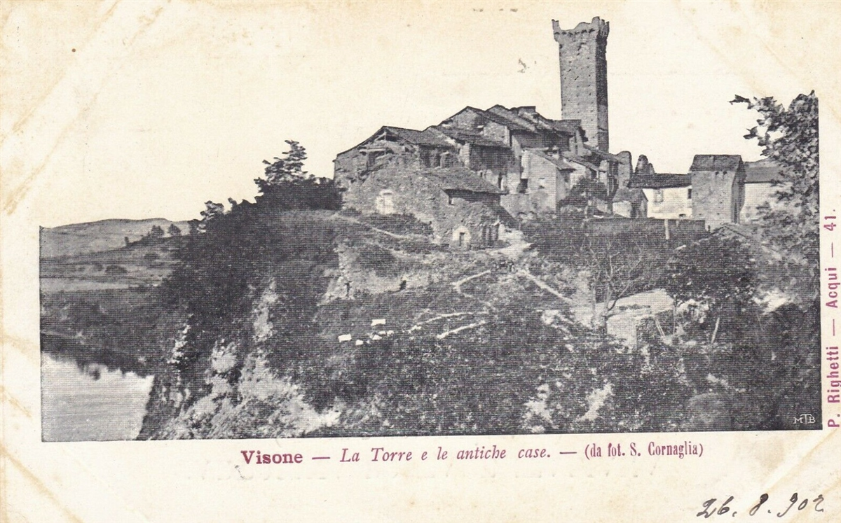 La Rocca con la torre rinascimentale, la porta di accesso alle mura (sulla destra) e le antiche case del Ricetto ora purtroppo abbattute, 1902