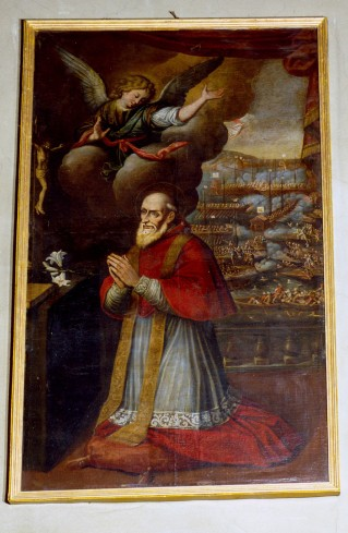 Sullo sfondo si vede una scena della battaglia di Lepanto. Un analogo dipinto, di autore incerto, è conservata presso i Castello reale di Racconigi. Opera conservata presso la chiesa parrocchiale dei SS, Pietro e Paolo di Visone